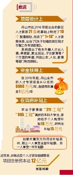 舟山市在2016年底出台的新区人才新政21条的基础上制定了10个配套细则,形成了“1+10”人才政策体系,出台了《关于加强自贸区招才引智工作专项政策》。