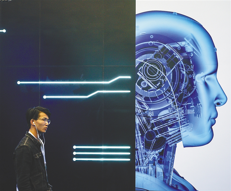 5月10日,参观者走过博览会上人工智能主题的海报。当日,2018全球人工智能产品应用博览会在江苏省苏州市开幕。本次博览会为期3天,共吸引来自10个国家和地区的200余家企业及人工智能机构参展,1000多种人工智能新产品集中亮相。 新华社记者 李响 摄