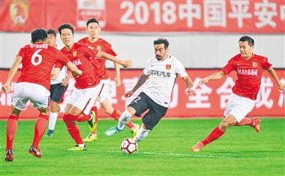 5月12日,在中超联赛第10轮比赛中,广州恒大队主场2:2战平河北华夏幸福队。图为华夏幸福队外援拉维奇(右二)遭到恒大队球员围堵。