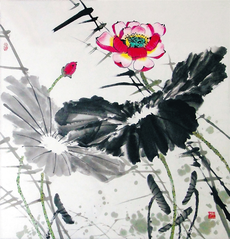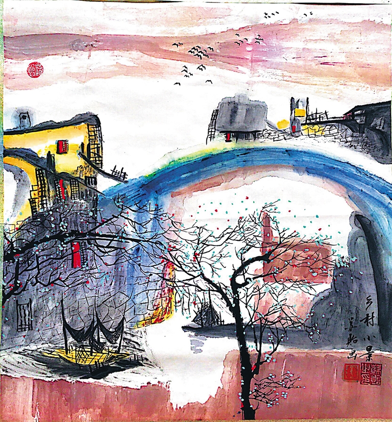 苏贻是海口市琼华小学教师,曾被授予“全国优秀少儿书画教育家”荣誉称号,她从小就对小桥流水人家、黑瓦白墙的江南民居有着特殊的情感。她的国画写意作品《乡村小景》,明亮而活泼,率性而生动,本极平常的村前屋后的一树一桥一塘,因为画家的肆意挥洒,而变得朝气蓬勃,浪漫辉煌。