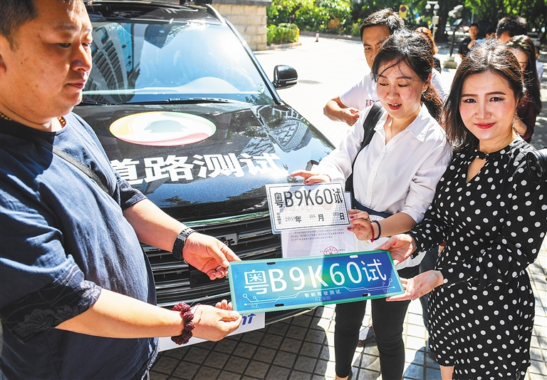 5月14日,腾讯公司工作人员展示智能网联汽车路测牌照。深圳当日向腾讯公司核发了智能网联汽车道路测试通知书和临时行驶车号牌,与该号牌对应的腾讯自动驾驶汽车可以在深圳市指定路段进行道路测试,测试期间必须配备驾驶员和安全员。 新华社发