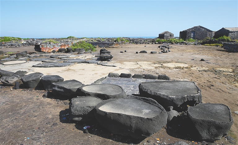盐田所在的峨蔓镇盐丁村,村口有一片面积很大的红树林。晒盐要经过晒沙、压沙、过滤海水成卤水等几道工序,盐丁村的人们把或圆或尖的石头凿平,留出沟槽,摆在一起,便成了晒盐的盐田了。