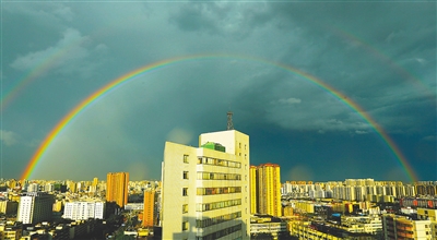 雨后的楼顶空气中带着点湿润,空旷的视野可以最大可能地看到完整的彩虹。虽然从出现到消失不过几分钟时间,但彩虹短暂的精彩与美丽更能给人留下深刻印象。