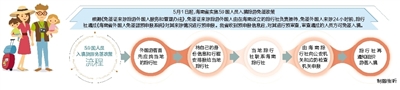 具体措施包括:增设“59国人员入境海南旅游免签”专用通道,实现适用政策国家入境游客“随到随走”,提高通关速度;提前向航空公司派发外国人入境卡片,便利游客提前准确填写入境信息,节省口岸入境候检时间;积极与出入境管理部门、省旅游委沟通,为未提前申报到达口岸的59国人员提供帮助;利用口岸入境大厅LED屏幕、悬挂易拉宝等宣传形式,介绍59国人员入境海南旅游免办签证相关政策及配套措施,不断提升中外出入境人员的满意度;加强前台引导人员培训,购置专业翻译设备,为入境外国游客等需要帮助的人员提供周到的人性化服务。