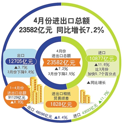 从需求看,投资增速略有回落,但投资结构继续优化。在扩大开放的系列措施影响下,我国外贸结构进一步优化。4月份,我国进出口总值同比增长7.2%,上月为下降2.5%。其中,出口增长3.7%,进口增长11.6%,贸易顺差收窄27%。