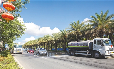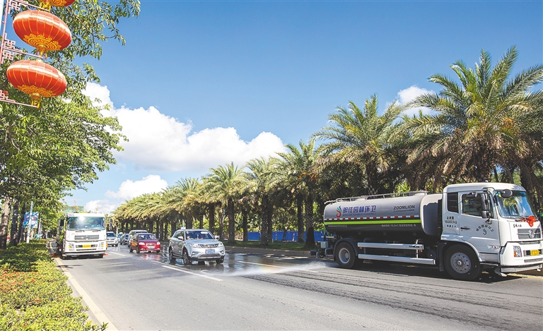 近日,三亚明佳园林环卫集团购进21辆新型环卫车,将该公司环卫机械化作业率提升至75%。图为5月15日刚刚投入使用的新型环卫车在三亚迎宾路进行喷水压尘及清扫作业。