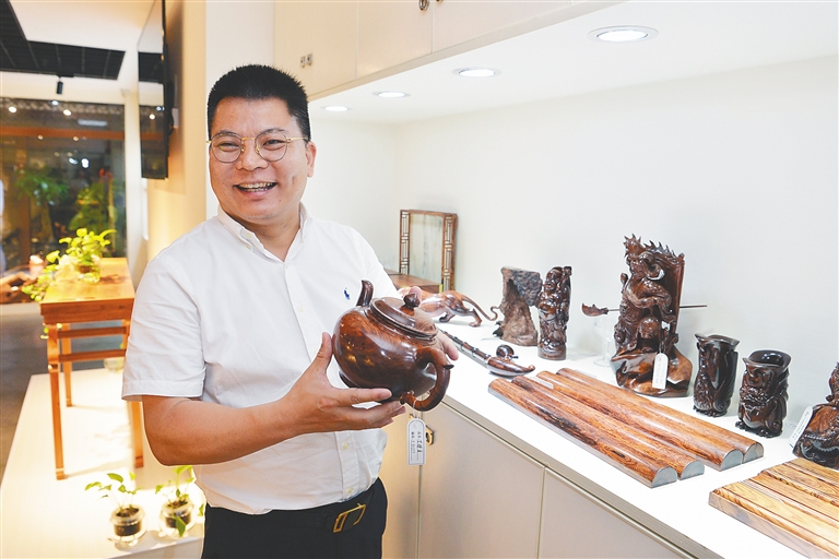 每次在外出差,中国工艺美术协会理事、省民协民间工艺专业委员会会长、三亚麻雕艺术集团创始人麻双鸣总喜欢到工艺品店转转,了解民间工艺师们的创作和产品销售情况。今天下午,他又转到了海口鼎臻古玩城的一家黄花梨工艺品店。