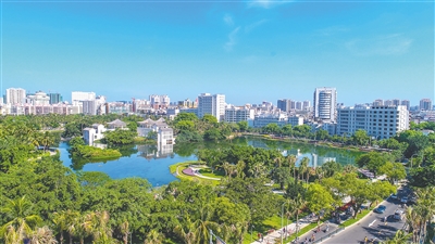 5月14日,经过生态修复后的海口三角池东湖公园在蓝天白云下美如画。据了解,海口东湖公园经过3个月水体治理后,绿化面积增加,水体逐渐变清,周围环境得到很大的改善。目前,这里已成为椰城市民最为喜爱的休闲场所之一。 本报记者 张茂 摄