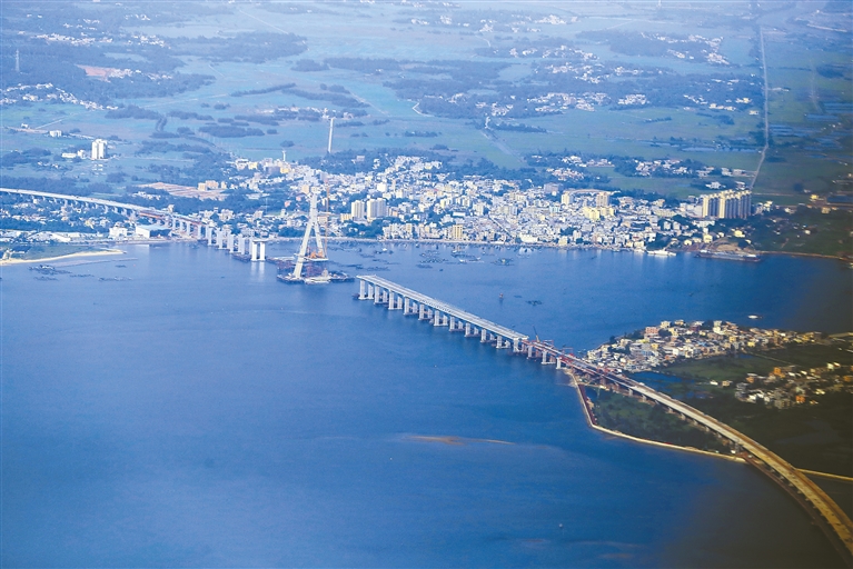 5月13日,高空俯瞰建设中的铺前大桥。截至目前,铺前大桥建设已完成总工程量的80%,大桥预计在今年年底建成通车。据了解,铺前大桥桩基、承台、墩身下部构造施工已经全部完成,正在全面进行上部构造施工,主桥目前正在进行钢箱梁斜拉索的施工,文昌侧引桥正在进行移动模架的现浇箱梁施工,跨断裂带引桥已经全部完成了20榀大阶段钢箱梁吊装工作。 本报记者 张杰 通讯员 张璐 摄