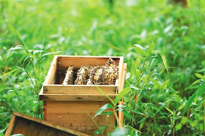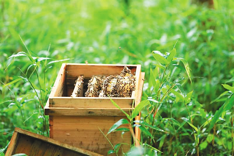 近日,笔者沿着乡村小路来到琼中黎母山绿源农民养蜂专业合作社,这里青山环抱,空气清新,橡胶树下摆放着一个个蜂箱,成群蜜蜂或在箱口徘徊,或在百花丛中嬉戏,酝酿浓浓“蜜意”。合作社负责人卓定雄从蜂箱里抽出一块板子,上面爬满了蜜蜂,他脸上洋溢着笑容说,“蜂蜜就是金子,能给乡亲们带来财富。”