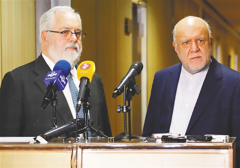 主管气候行动与能源的欧盟委员卡涅特(左)与伊朗石油部长举行新闻发布会。新华社发