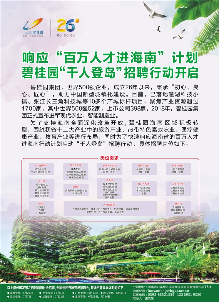 响应“百万人才进海南”计划 碧桂园“千人登岛”招聘行动开启
