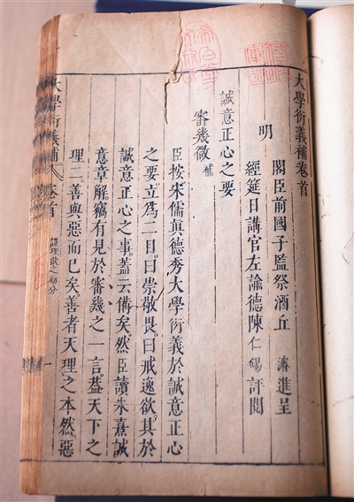 丘濬还在奏章中对明孝宗恳切陈词,他之所以编撰这部巨著在于:“伏念臣濬远方下士,叨冒朝廷厚禄,六转官阶……常恐一旦委命九泉,有负国恩,无以为报。”丘濬凭一介来自海外“蛮荒”之地的学子之身,登进士第,不断升迁,成为翰林院学士,官至礼部尚书、文渊阁大学士等职,主要归结于他一生勤于政事,忠于职守,功勋卓著,从而得到孝宗的赏识和重用。然而,他却称自己受之有愧,冒领朝廷厚禄,战战兢兢,害怕一旦身死,有负皇家恩典,没有功绩报答朝廷。因此,尽管他自谓“所见不能无偏,所纂不能不误”,仍然呕心沥血撰写这部巨著。见诸这些文字之外,他奉献的是一颗拳拳的忠君爱国之心。这发力点,使奏章力透纸背。贯穿在奏章中的是他那强烈的愿望,一种古为今用、经世济用的精神:“虽曰掇拾古人之绪余,亦或有以裨助圣政之万一。伏望皇上宽其妄作之诛,察其愿忠之意,”“遇用人则检正百官之类,遇理财则检制国用之类,”“酌古准今,因时制宜,以应天下之务。”丘濬说得恳切、委婉,自谦之中,蕴含一种热切的期待。这种愿望一以贯之。可以说,丘濬不是为了《大学衍义补》能刊刻名山而进奏,而是希冀《大学衍义补》能成为明孝宗的治国理政读本而进奏,为弘治新政、为明朝的振兴而进奏。