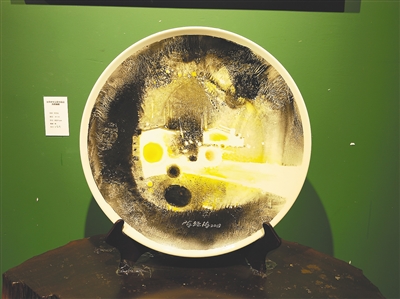 进入二楼展厅,首先映入眼帘的就是陈显栋先生的瓷画作品。他的作品虽然貌似西方的抽象油画作品,却饱含中国传统文化的底蕴,很多路过的观众会发出惊叹:“啊,太美了!这真的是瓷画作品吗?”