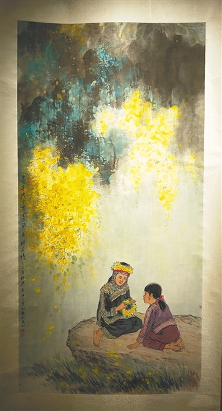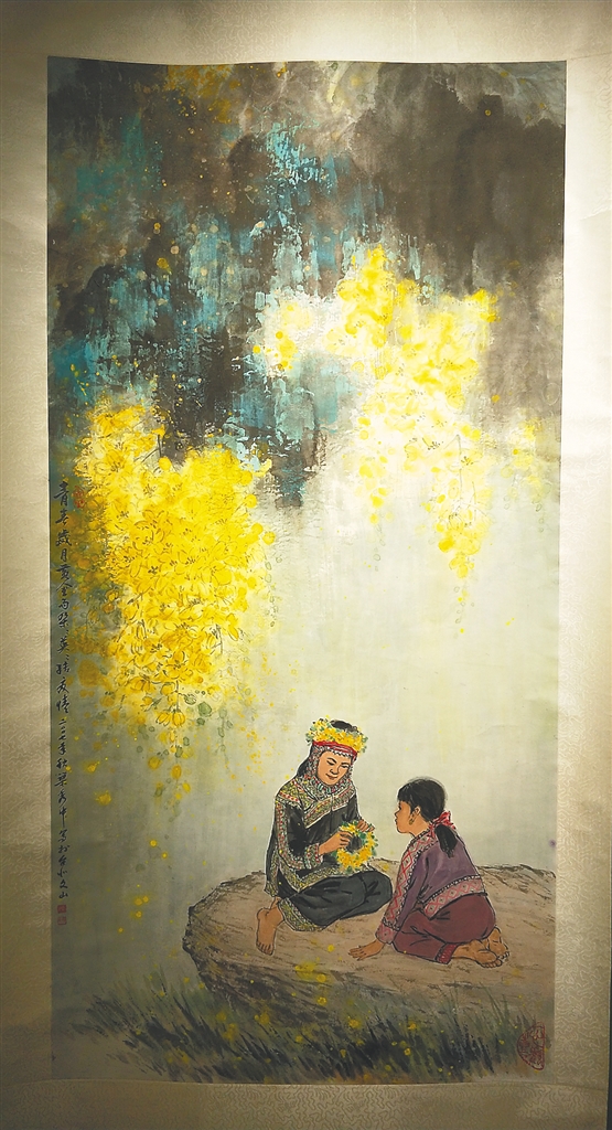 “青春岁月黄金雨,朵朵英英结夏情。”这是梁秀中的作品《黄金雨》的落款,正如诗中所描绘的一样:夏季时分,有“黄金雨”之称的阿勃勒花争相竞艳,花序为向下垂悬,在高大的树木开花,花朵有如从天而降,就像是蓝天底下起了金黄色的花雨一般,台湾原住民少女坐在地上,沐浴着“黄金雨”,用阿勃勒花编织花环,别具诗情画意。