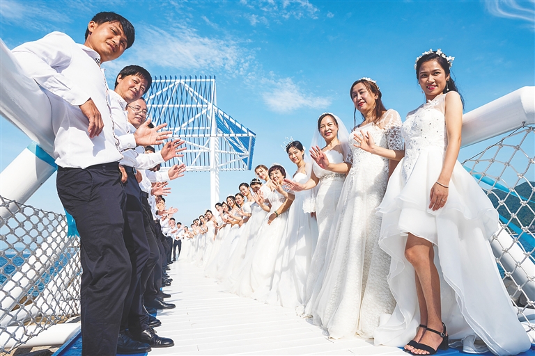 5月20日,一场海岛集体婚礼在陵水黎族自治县分届洲岛景区举行。来自国内外的20对新人身着白色婚纱礼服在海浪拍打的海岸边盟誓,留下一生难忘的幸福记忆。本报记者 武威 通讯员 童国强 摄