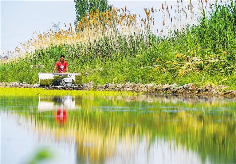 近日,随着气温渐高,地处新疆伊犁河谷的察布查尔锡伯自治县迎来插秧高峰期,田间地头一派繁忙景象。块块稻田水满如镜,田间防护林枝繁叶茂,远处雪山依稀可见,如一幅在大地上铺展开的生态画卷。 新华社记者 胡虎虎 摄