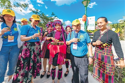 在什寒村,黎族苗族村民唱起山歌,端起酒杯,欢迎远道而来的客人。嘉宾们品尝着醇香糯米酒和香甜蜂蜜水,感受着琼中人民的热情好客。