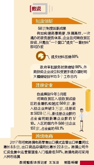 河南自贸区入驻自贸试验区的金融机构超过500家,新入驻企业突破3万家,注册资本3828亿元,新注册企业数约占全省同期新增企业数的1/10。入区的国内外500强企业137家,占全省的48.1%