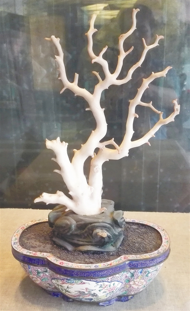 红珊瑚文化在中国也有悠久的历史。很早以前,中国人就把红珊瑚作为财富、权贵和幸福的象征。帝王富豪之家,多以珊瑚作为陈设装饰。班固的《汉武帝事》就记载,“武帝起神堂前庭,植玉树,茸珊瑚为枝。”即以玉石为干、珊瑚为枝制作盆景供奉神堂。三国的曹植曾作诗《美女篇》说:“明珠交玉体,珊瑚间木难;罗衣何飘飘,轻裾随风还。”将珊瑚与明珠、玉体、木难(一种碧色珠)相提并论,用它来陪衬美女的婀娜身姿和皓洁肌肤。