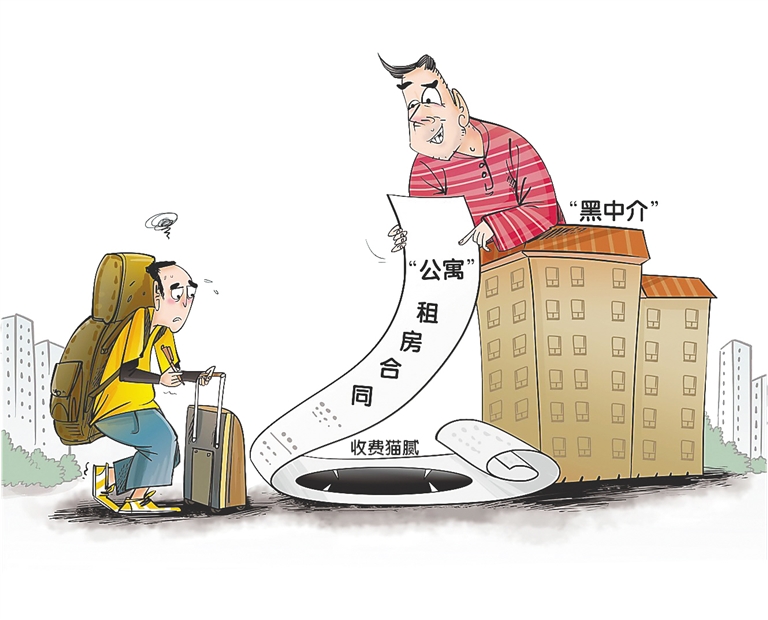 记者调查发现,目前租赁市场上“黑中介”、虚假房源、中介收费不合理等乱象仍屡禁不止。在北京租房的张女士从一家中介处租到一套小两居,以“押一付三”的方式交纳了近万元租金。可是刚住进去一个月,中介就通知她房东要将房子收回,并以各种方式威逼她退房,等张女士报案后才发现是“黑中介”。