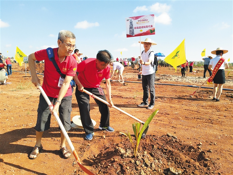 图为23日上午,300名回访知青来到桂林洋国家热带农业公园“芳华知青林”,共同种下象征亲情与友情的金椰子树苗,并参观桂林洋国家热带农业公园。