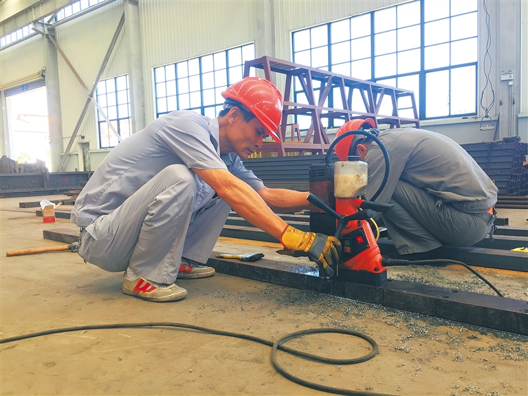 手持卡尺,对照图纸在钢板上刻下尺度,按照尺度刻好打孔位置,再以磁力钻垂直钻孔……近日,在海南省建筑产业化股份有限公司模具车间里,陆升半蹲在地上,专心地对一批装配式建筑构件模具进行打孔。
