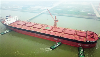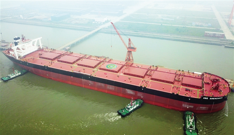 “深圳号”40万吨级矿砂船由扬子江船业集团建造,该船总长362米,型宽65米,船身内部配备7个货仓,1个液化天然气舱。 新华社发(计海新 摄)