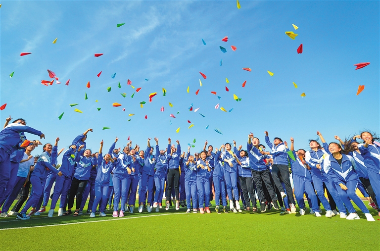 5月30日,邯郸市邯山区第一中学高三学生将写有梦想的纸飞机抛向天空。