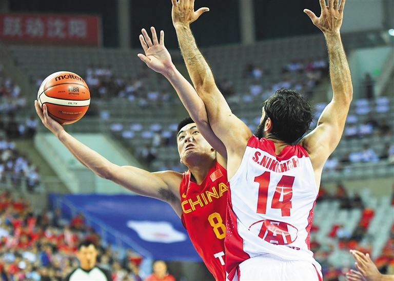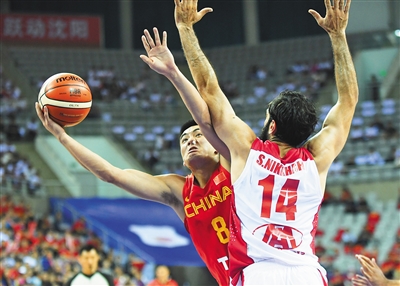 图为中国男篮蓝队球员于德豪(左)在比赛中上篮。 新华社发