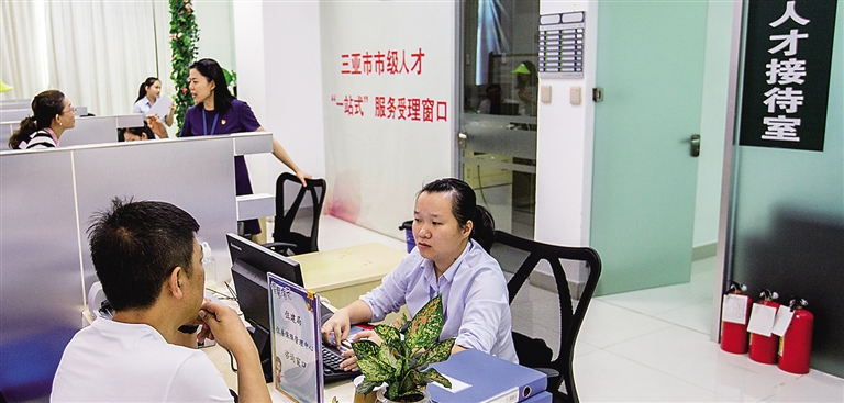 5月30日,三亚市、屯昌县人才服务“一站式”平台投入使用,均实行“一站式受理、一次性告知、一条龙服务”,提供落户、社保等服务。图为三亚市人才服务“一站式”平台服务窗口正在办理业务。