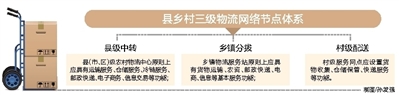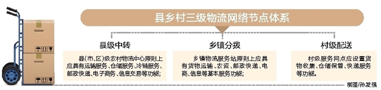 《意见》提出,加快推进农村物流服务基础设施建设,统筹规划县乡村三级物流网络节点体系;合理确定农村物流节点服务功能,合理区分各级物流节点数量、规模和功能;县(市、区)级农村物流中心原则上应具有运输服务、仓储服务、冷链服务、邮政快递、电子商务、信息交易等功能;乡镇物流服务站原则上应具有货物运输、农资、邮政快递、电商、信息等基本服务功能;村级服务网点应设置货物收集、仓储保管、快递服务等功能。