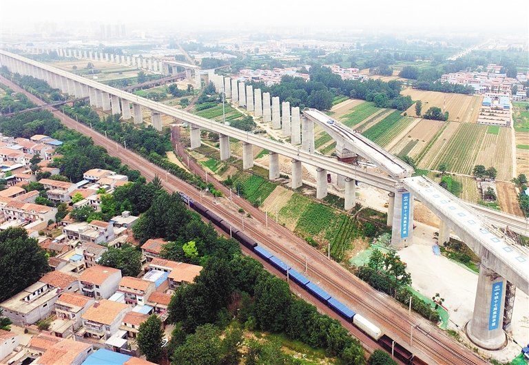 这是5月30日无人机拍摄的转体成功后的商合杭高铁上跨既有陇海铁路连续梁。