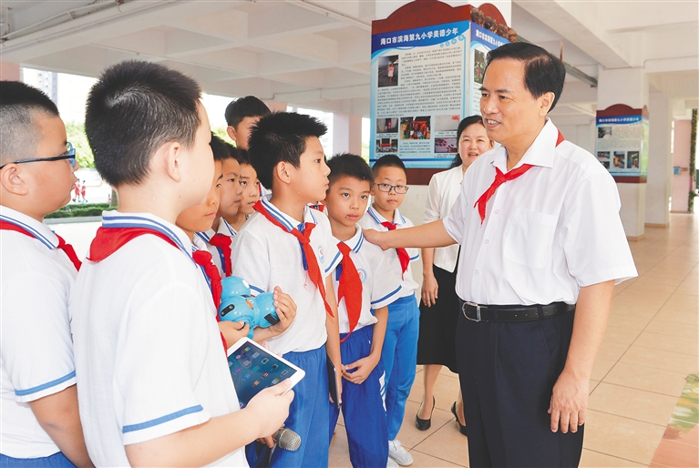 走进海口市滨海第九小学,刘赐贵一行被丰富多彩的兴趣课程吸引,同学们有的在上英语课、舞蹈课、音乐课、体育课、书法课,还有的在练习机器人编程,为即将到来的全国比赛作准备。“未来,中国特色自由贸易港要靠你们来建设。”刘赐贵勉励同学们,好好学习、全面发展、增强本领、打牢基础,抓住信息时代的学习机遇,成长为具有敢闯敢试特区精神、同时掌握科学规律的创新人才,为建设美好新海南和实现中华民族伟大复兴的中国梦作出自己的贡献。