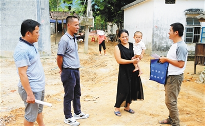5月31日,白沙黎族自治县打安镇脱贫攻坚大队南达村小队长符明现(右一)、副小队长田永贵(左二),到南达村木瓜村民小组贫困户李小密家实地了解危房改造进度情况。当日,白沙在11个乡镇设立的脱贫攻坚大队揭牌开展工作,队员们按职责深入贫困户家中,面对面了解产业帮扶资金流向,了解教育资金、医疗补贴等具体情况,进一步采集精准信息。