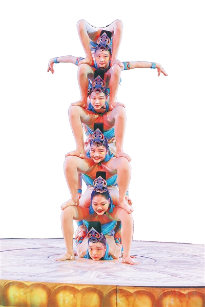 《柔术造型》的创作灵感来源于古丝绸之路上的石窟壁画,通过5名演员超越极限的肢体语言、复杂多变的优美造型以及流畅细腻的切换配合,展现出丝路的生命力与永恒之美。《单手倒立》动作模仿翱翔之鸟,仅一名演员在独立支架上表演单手倒立支撑,变幻出千姿百态的飞行造型。