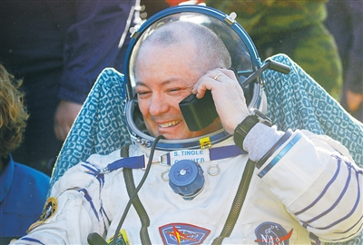 6月3日,在哈萨克斯坦杰兹卡兹甘东南部,美国宇航员斯科特·廷格尔与家属通话。