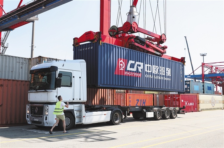 日前,在德国汉堡,塔吊将一个中欧班列集装箱放置在一辆卡车上。