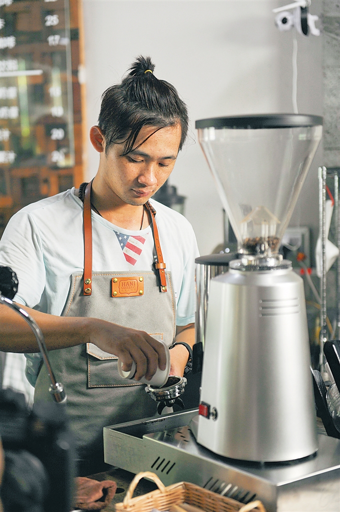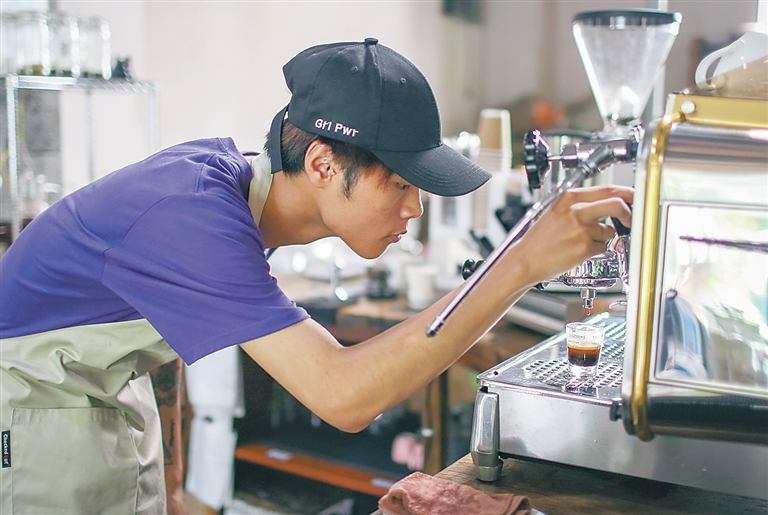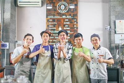 咖啡店内6个员工年龄从19岁到30岁不等,各有分工。扎着小辫的店长吴旻哲是个帅气的小伙,脸上总是挂着微笑,他也是店里技术最好的咖啡师。“我很喜欢喝咖啡,成为咖啡师是我的梦想。”吴旻哲通过微信打字告诉记者,之前他换过10份工作,来咖啡店后,学会了手冲咖啡、拉花等技术,很有成就感。