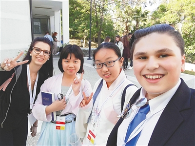 对于海中学生而言,交流和展示文化的契机,不仅在正式的研讨会议中,更体现在会议之外的交流时间中。在短暂的交流时光中,他们做起中国文化交流使者,以一言一行,传播中华文化。