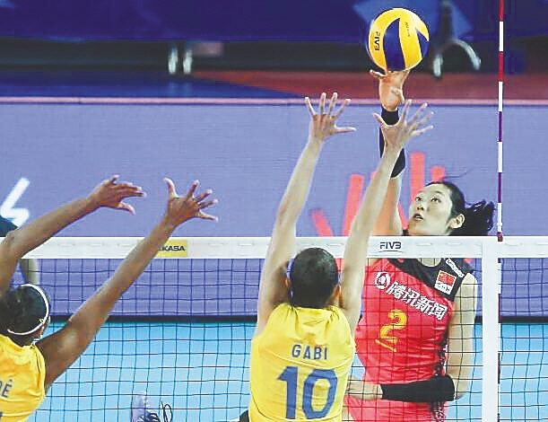 6月5日晚,在世界女排联赛江门站首日比赛中,中国女排苦战五局以2∶3不敌巴西队,五局比分为25∶19、23∶25、25∶27、25∶10和14∶16。朱婷首发得到全场最高的34分,新秀李盈莹替补得12分。图为朱婷(右)在比赛中扣球。小新发