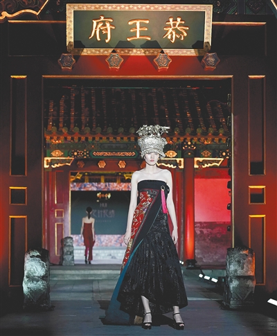 6月4日,2018“锦绣中华—中国非物质文化遗产服饰秀”系列活动在北京恭王府拉开帷幕,在为期6天的活动期间,将上演11场以中国非物质文化遗产为主题的服饰秀,赵卉洲、张义超、郭瑞萍等国内知名设计师将通过展示利用各种非遗元素设计的现代时装,弘扬中国传统文化。图为模特在展示赵卉洲设计的主题为“艺针忆绣”的具有苗绣元素的时装。