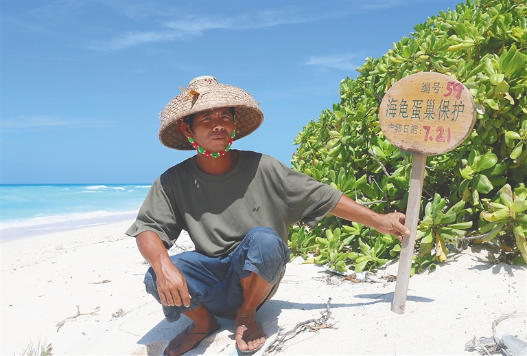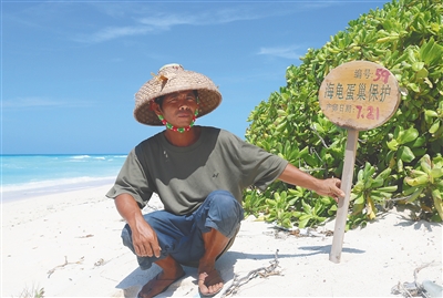 三沙市北岛社区渔民陈炎在沙滩上立起了海龟蛋巢保护记录牌。为了保护海洋生态,三沙市北岛社区居委会组织人员每天环岛巡逻,每发现一巢海龟蛋,都要制作记录牌,注明编号和产卵日期,细心呵护海龟宝宝。