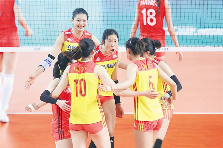 6月6日晚,在世界女排联赛江门站第二轮比赛中,中国队以3:0(25:21,25:19,25;22)战胜俄罗斯队。图为中国队队员庆祝得分。小新发