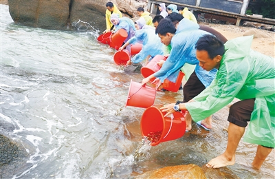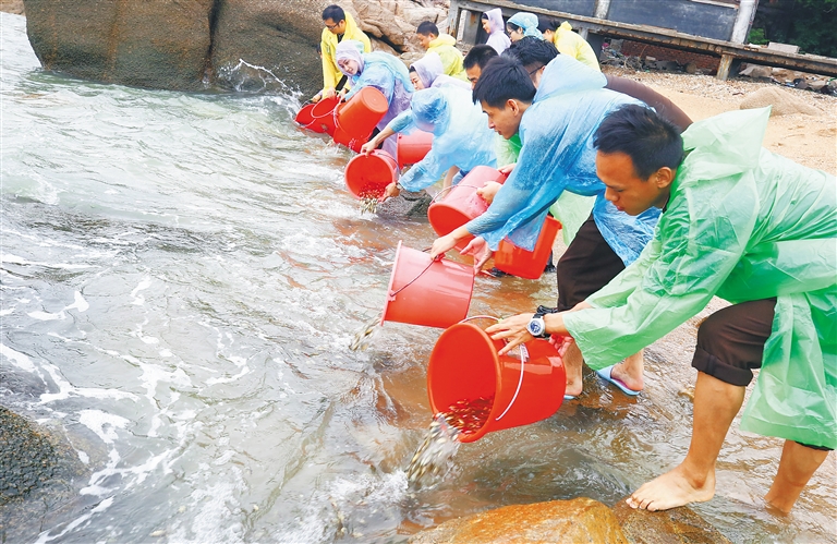 当天是“全国放鱼日”,“保护海洋,守护未来”2018全国放鱼日增殖放流活动在三亚南山景区小月湾举行。本次活动放流红鱼、金昌鱼苗,共5.3万余尾。