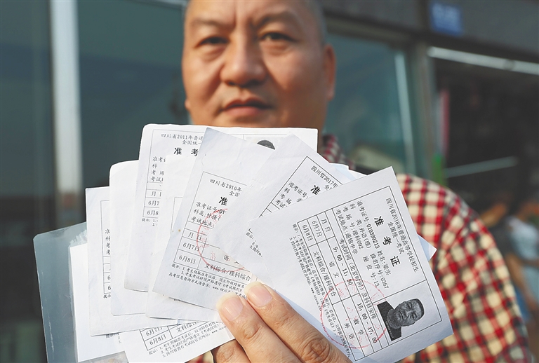 6月7日,梁实在展示历年参加高考的部分准考证。 2018年6月7日,51岁的成都考生梁实第22次走进高考考场。从1983年参加高考至2017年,梁实已经参加过21次高考,始终没有考上心中理想的大学。 1983年,梁实第一次参加高考,之后连续复读5年仍没有考上。再后来,他结婚、生子、经商。2001年全国高考取消年龄与婚否限制,梁实再次走进高考考场。 梁实说:“从第一次高考算起,坚持了35年,不为别的,只为圆一个大学梦!” 新华社记者 江宏景 摄