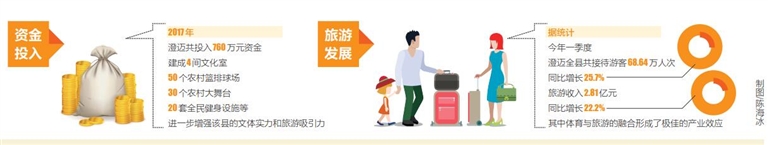 “以澄迈自2006年以来参与举办的环岛自行车赛为例,每次赛事都会有骑友以及大量随行亲友、后勤保障团队人员来到澄迈,带动酒店住宿、餐饮、健康医疗、乡村旅游等相关产业发展。”澄迈县文体有关负责人表示,举办自行车赛事也加速推动了全县路网交通、体育场馆等基础设施建设,仅2017年,澄迈共投入760万元资金建成4间文化室、50个农村篮排球场、30个农村大舞台及20套全民健身设施等,进一步增强了该县的文体实力和旅游吸引力。
