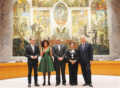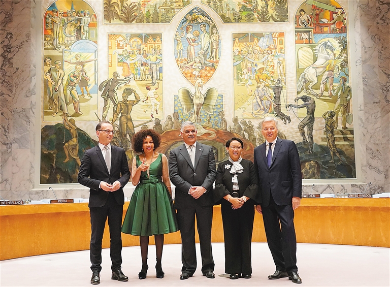 6月8日,在位于纽约的联合国总部,德国外长马斯、南非国际关系与合作部长西苏鲁、多米尼加外长巴尔加斯、印尼外长蕾特诺和比利时外交大臣雷恩代尔(从左至右)合影。