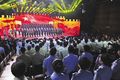 6月9日晚,海南省公安系统模范集体和模范人民警察表彰大会特别节目在海南广播电视总台演播大厅举行,通过文艺节目表演,歌颂了我省公安英雄模范的光荣事迹。图为集体表演大合唱《中国人民警察警歌》。本报记者 袁琛 摄