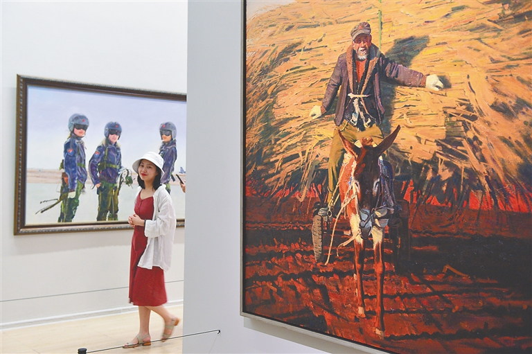 6月10日,参观者在中国美术馆欣赏“第六届全国青年美术作品展览”的参展作品。